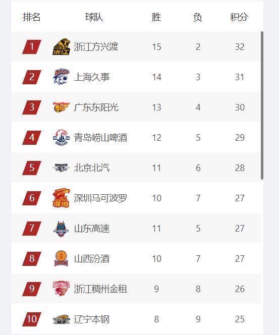 CBA最新排名,上海队稳居第2,首钢队跌至第5,辽宁队第10
